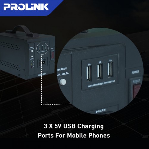 The PROLiNK PPS70 Portabel Solar (PPS) adalah power supply unit yang kompak dan user-friendly cocok untuk digunakan di dalam atau luar ruangan. Unit portabel ini mungkin tampak kecil tapi dilengkapi dengan 230VDC yang dapat digunakan untuk menyalakan lampu hemat energi atau lampu LED hingga 11W. Selain itu, ada juga port USB 5VDC untuk pengisian perangkat mobile Anda dan pin konektor 12VDC untuk peralatan seperti kipas DC. Unit ini dirancang dengan fleksibilitas yang didukung oleh pasokan listrik AC, modul surya PC atau melalui baterai disediakan.